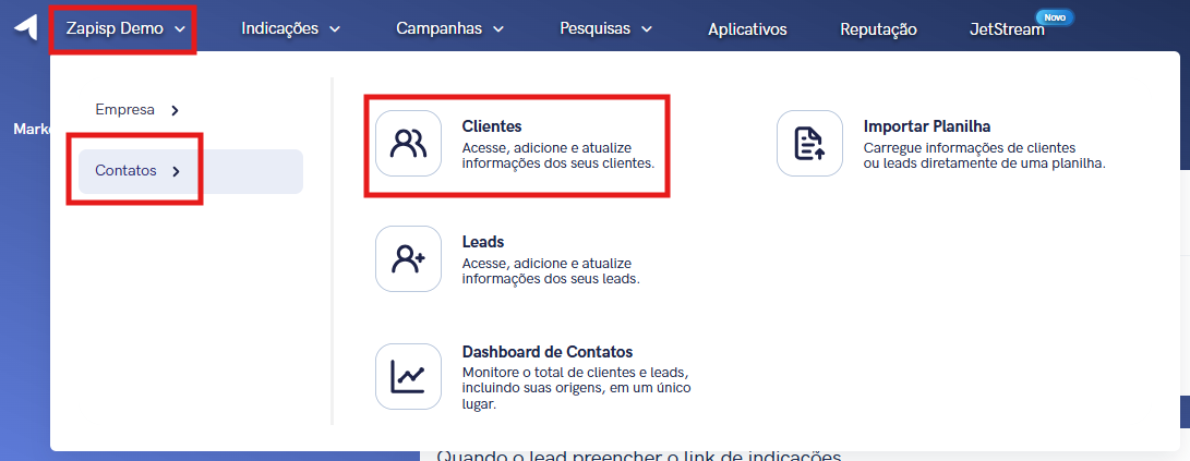 1. Para começar clique no nome do seu provedor no canto superior esquerdo, Contatos > Clientes > Adicionar Cliente