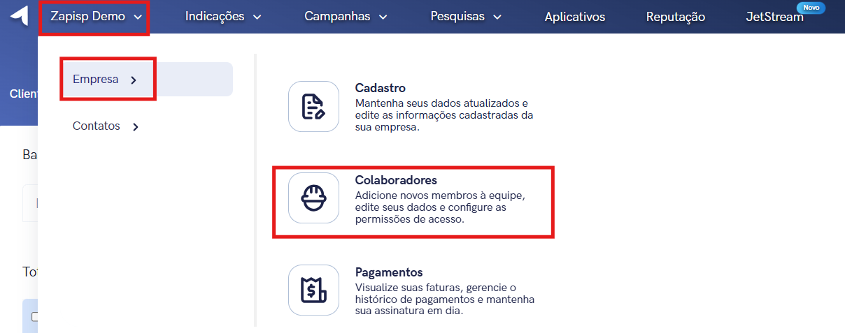1. Acesse a aba com o nome do seu provedor e clique Empresa e depois em Colaboradores