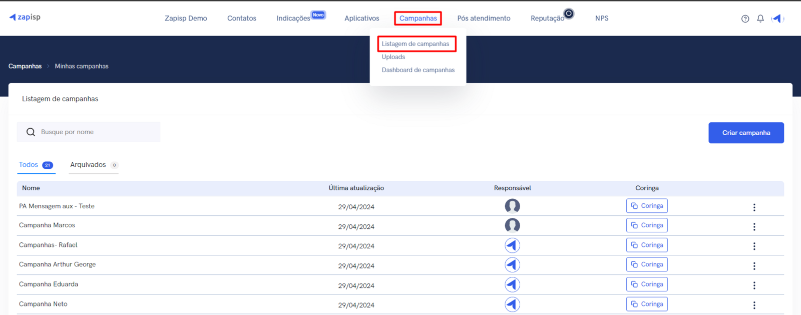 1. O primeiro passo é encontrar as campanhas de gatilhos que já vem configuradas junto com sua conta no Zapisp ou criar novas seguindo esse artigo. Para isso vá em Campanhas > Listagem de Campanhas.